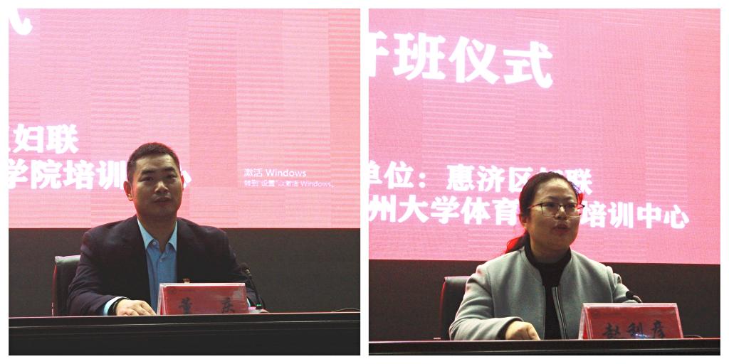 开班仪式上,学院副院长董庆简要介绍了本次培训的特色和安排,惠济区妇联主席赵利彦强调了本次培训的重要意义并向学员提出了具体要求。惠济区妇联副主席李平出席仪式,国家社会体育指导员培训中心主任肖勇主持仪式。