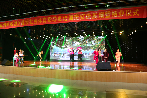 10月27日上午9时,由我院培训中心承办的2014年河南省“四区”建设社会体育指导员培训班交流展演暨结业仪式在大学生活动中心隆重举行(四区是指城市社区、新农村社区、产业集聚区和革命老区、整体搬迁区)。省老年人体育协会主席马宪章,省老年人体育协会副主席、秘书长王玮,省体育局巡视员毛宏,郑州大学体育学院党委书记魏真同志,郑州大学体育学院院长巫兰英以及省社会体育管理中心书记刘宝祥同志,省老年人体育协会副秘书长魏来周同志,省体育局群体处副处长曲哲同志等领导出席结业仪式,并观看交流展演。巫兰英院长主持结业仪式。