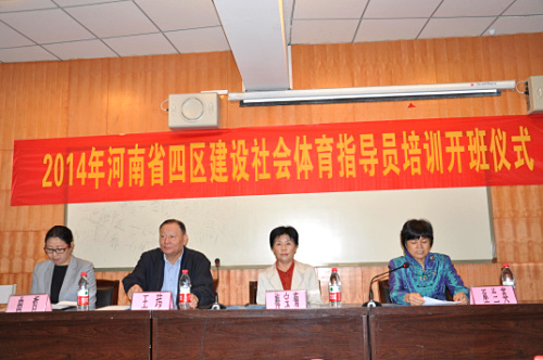 10月16日上午,2014年河南省“四区”建设社会体育指导员培训班开班仪式在我院隆重举行(四区是指城市社区、新农村社区、产业集聚区和革命老区、整体搬迁区),来自河南省滑县、永城等10个县(市)的“四区”基层老年人活动站点的130位学员参加了本次培训。河南省体育局副局长梅宝菊同志、河南省老年人体育协会副主席王玮同志、郑州大学体育学院院长巫兰英同志、河南省体育局群体处副处长曲哲同志出席了开班仪式,并作讲话。梅宝菊同志在讲话中指出国家对社会公共体育活动的高度重视,肯定了四区建设社会体育指导员的专题培训工作,希望受训学员回到地方后能积极促进全民健身活动,丰富群众的体育文化生活。巫兰英院长强调了此次培训的重要意义,介绍了我院的基本情况和本次培训工作的主要安排,并期许进一步完善培训制度,提高培训水平,力争为我省老年人体育事业的发展做出积极的贡献。